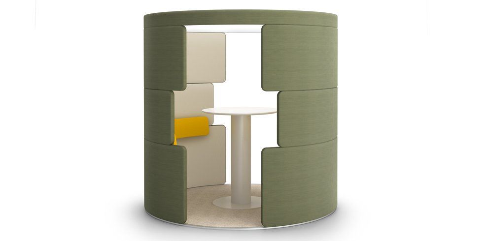 Ein stabiles, beidseitig gepolstertes Raum-im-Raum-Element mit oder ohne Dach – die Version mit Dach enthält eine optionale Beleuchtung. Die runde Toguna ist in zwei Größen erhältlich: Toguna high für Kommunikation im Stehen, Toguna low für Abstimmungen im Sitzen.